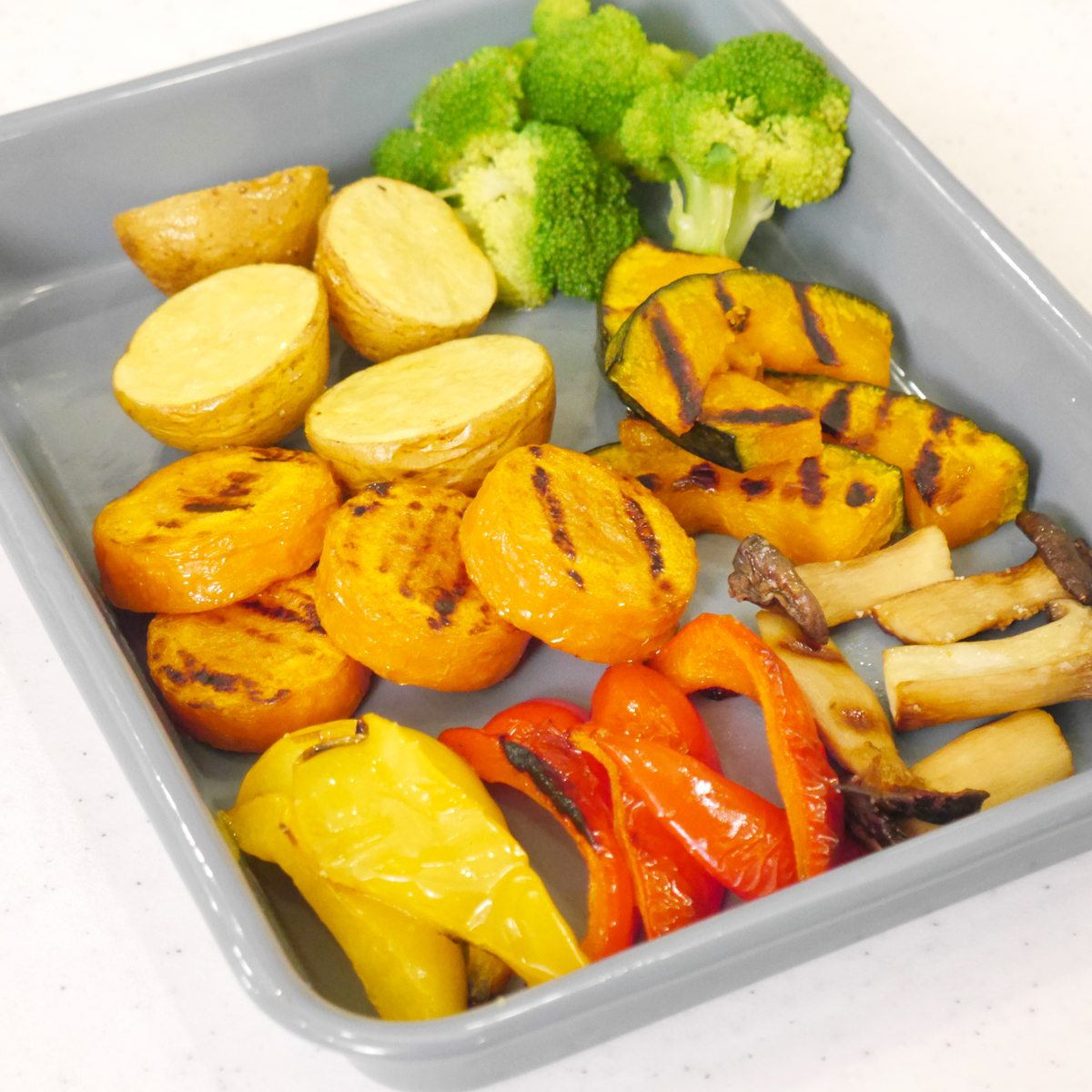 【添え野菜】は大きめに切り、塩とオリーブオイルを和える。グリルで焼目がつき、串が通る柔らかさになるまで焼く。(ブロッコリーは焼かずに下茹で)