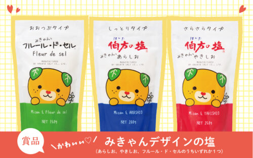 みきゃんデザインパッケージの塩(あらしお、やきしお、フルール・ド・セルのうちいずれか1つ)/ 10名様